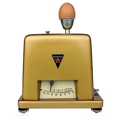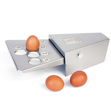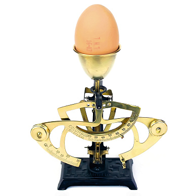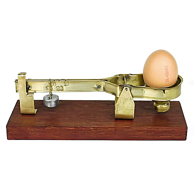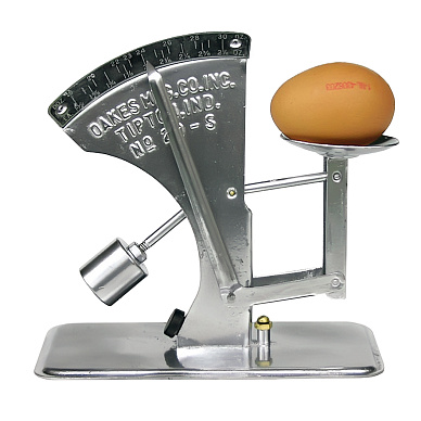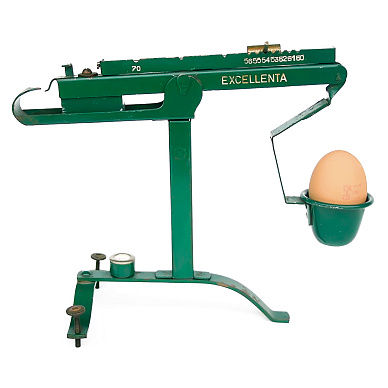 Ну а чтобы взвесить, нужны весы. Кто, когда и где изобрел их – неизвестно. Одни из первых таких весов относятся к 1918 году. Самые ходовые модели выпускала американская фирма Reliable Manufacturing Company. Первое поколение весов имело деревянное основание и очень простую конструкцию: на одном конце гиря, на другом – слот для яйца. Вспомогательные элементы – еще пара гирек, одна из которых подвешивается к коромыслу, а другая перекидывается из стороны в сторону от точки опоры. Такие весы были предназначены для яиц массой от 19 до 22 унций в дюжине (в Великобритании, которая одна из первых после США приняла систему реализации яиц по категориям, яйца продаются дюжинами, а не десятками).