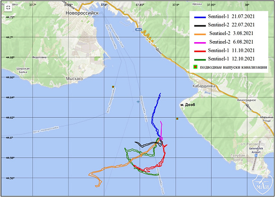 «В районе обнаружения пятен, помимо затонувшего парохода, расположены судоходная трасса и якорная танкерная стоянка, а к северо-востоку от него, в 900 метрах от берега, — подводный выпуск канализационной трубы. Это осложняло определение источника и характера пятен на поверхности моря. Однако анализ архивных съёмок, начиная с 2017 года, показал, что ранее подобные пятна в этом месте не наблюдались», — рассказывает Антон Чайка.