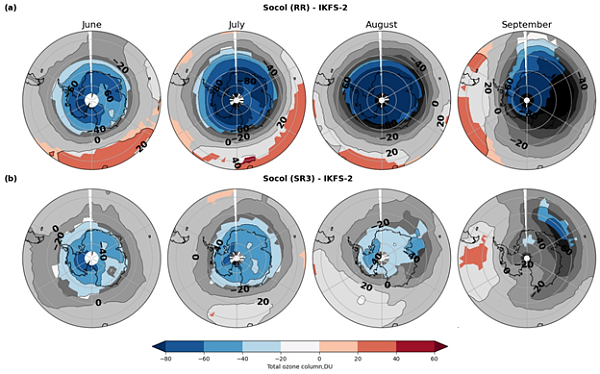 Ученые применили модуль фотолиза Cloud-J версии 8.0, который увеличил точность расчетов скоростей фотолиза при низких углах Солнца, что особенно важно для полярной области. Это улучшило представление о сезонном цикле озона южной полярной области и моделирование общего содержания озона в регионе.