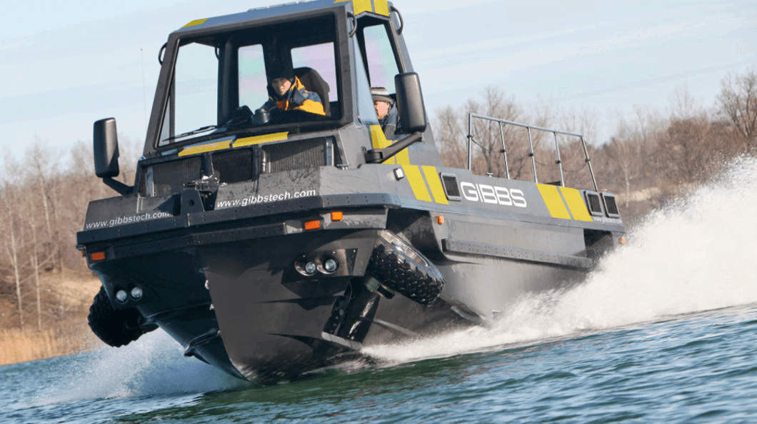 Техника компании Гиббса, созданная для развлечения, отличается способностью легко преодолевать водные преграды и приличными скоростями как на суше так и на воде.