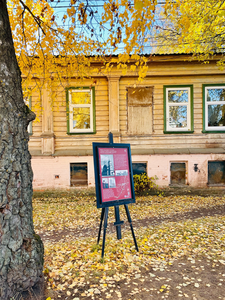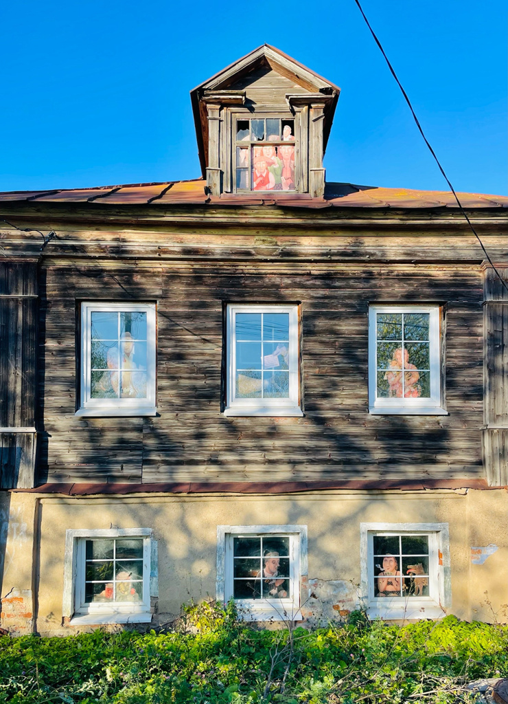 Встретила милоту: старый дом будут реставрировать. Но пока этого не произошло, в окна поселили персонажей из картин художника.