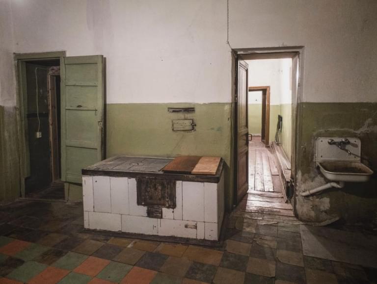 Стандартная коммунальная кухня, на первый взгляд. Но мозг слегка напрягается: ПВХ плитка, печь и нестандартная геометрия кухни будто искажают пространство. А ещё здесь слишком пусто для жилой коммуналки, но это легко объяснить. Дело в том, что в квартире последние годы живёт только одна бабушка. Она — бывшая соседка Бродского, который жил здесь с 1955 до 1972 года (до своего отъезда из СССР). Да, это дом Мурузи, и здесь находятся те самые "полторы комнаты". Вот уже несколько лет идут попытки официально открыть музей поэта, но всё упирается в соседку, которая живёт в квартире всю жизнь и уезжать наотрез отказывается. И её можно понять.