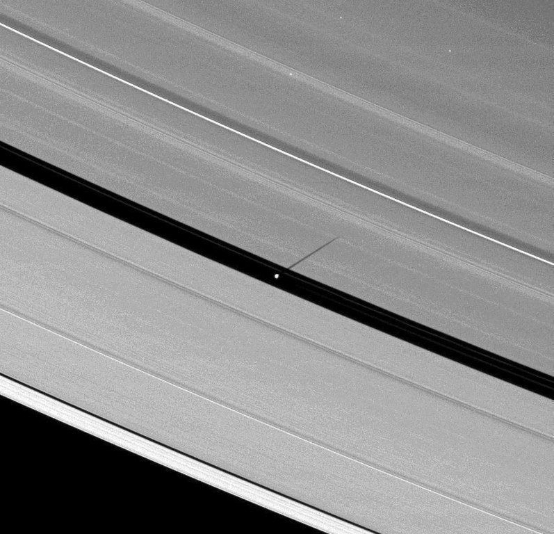 В) Спутник, отбрасывающий тень на кольца Сатурна