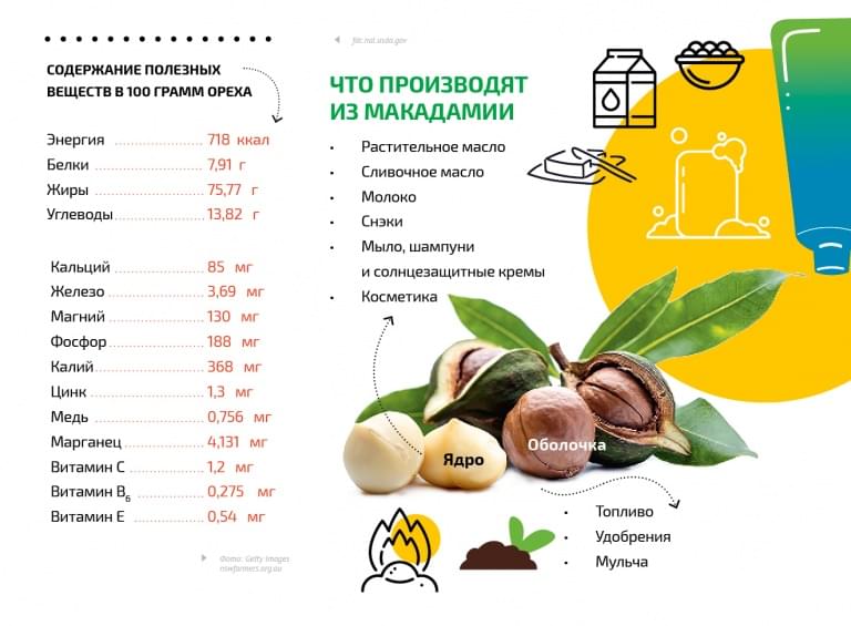 Сейчас орех макадамия все еще любим и популярен, хотя дороговат для многих. Если в 70-х было выращено около 6 т макадамии, то в наши дни ежегодно производится около 50 т орехов. Едят их по-разному: цельным, покрывают шоколадом или карамелью, добавляют в выпечку и салаты, выжимают масло. В макадамии содержатся полезные жиры, витамины групп B и PP, белки и довольно много марганца и меди. Зачастую этому орешку приписывают помощь в борьбе со всеми болезнями: от сахарного диабета второго типа и сердечно-сосудистых заболеваний до вывода холестерина и лечения акне. Действительно, исследования показывают, что употребление орехов может благотворно влиять на уровень холестерина, работу сосудов и сердца, но не стоит возлагать все надежды на один лишь орех – чтобы быть здоровым, нужно следить за всем питанием.