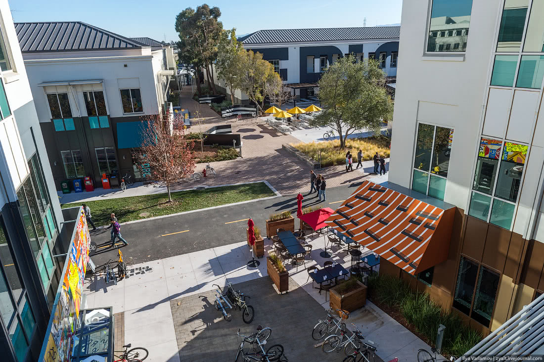 Снаружи офис ничем не примечателен. Обычные малоэтажные офисные здания, людей нет, даже вывесок никаких нет. Раньше здесь был офис SUN и другие IT-компаний. Вот так выглядит вход, через который на работу ходит Марк Цукерберг