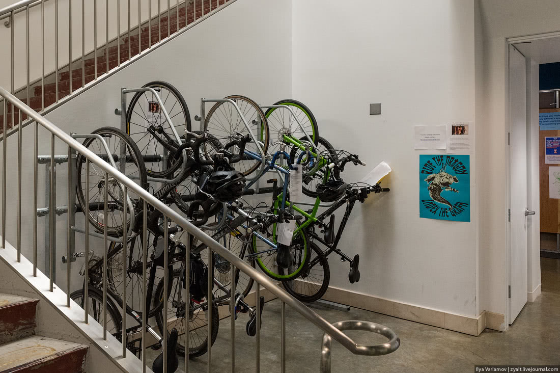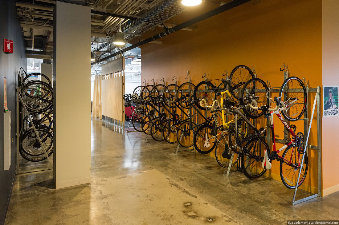 Многие сотрудники приезжают на работу на велосипедах. Парковки прямо около кабинетов