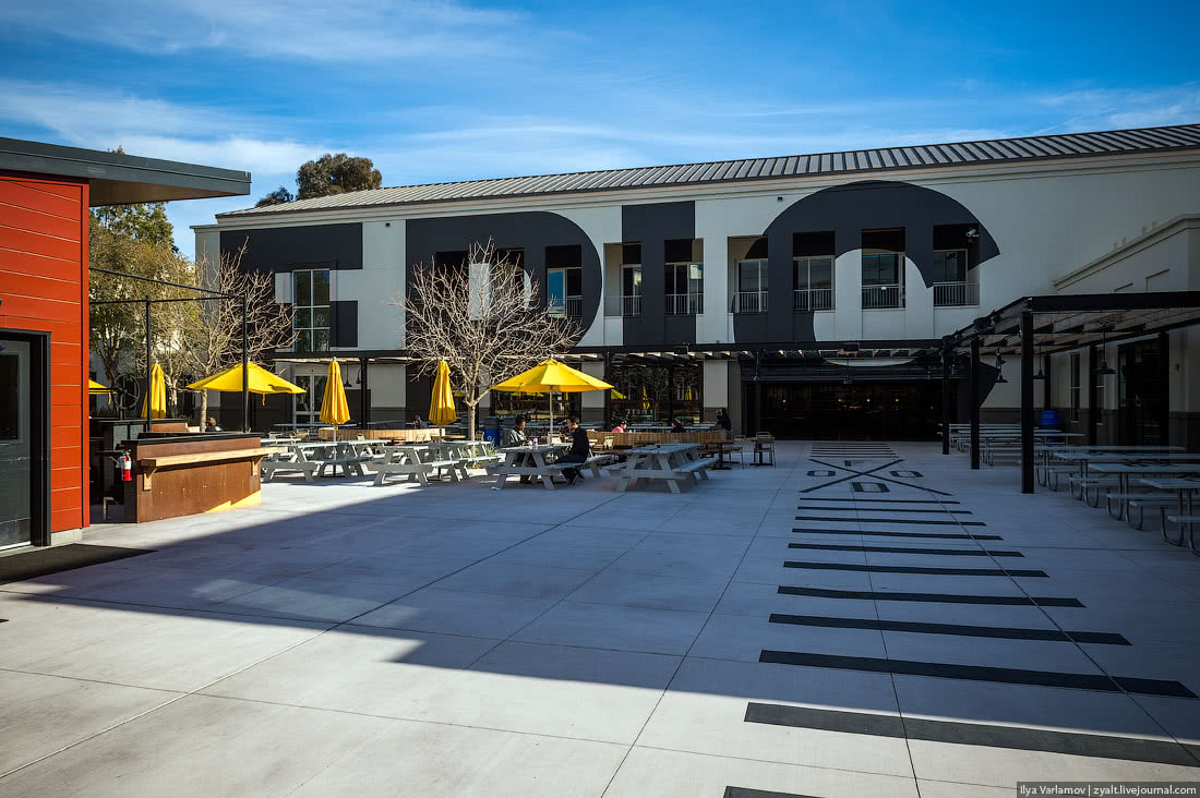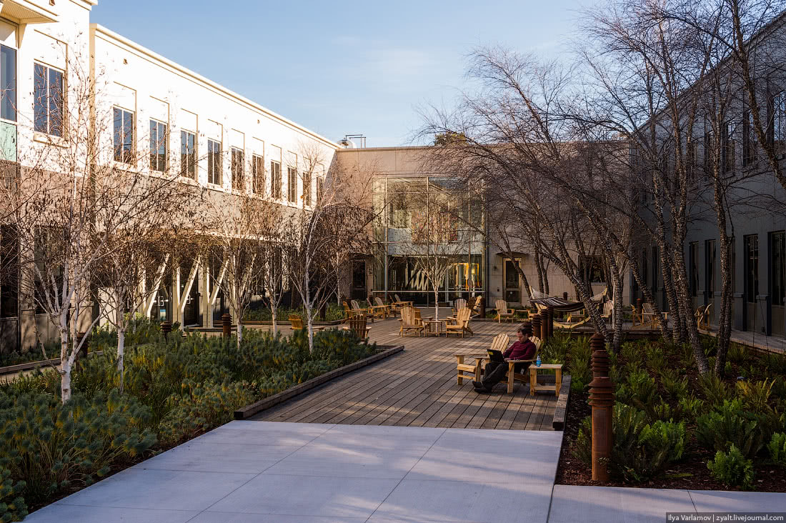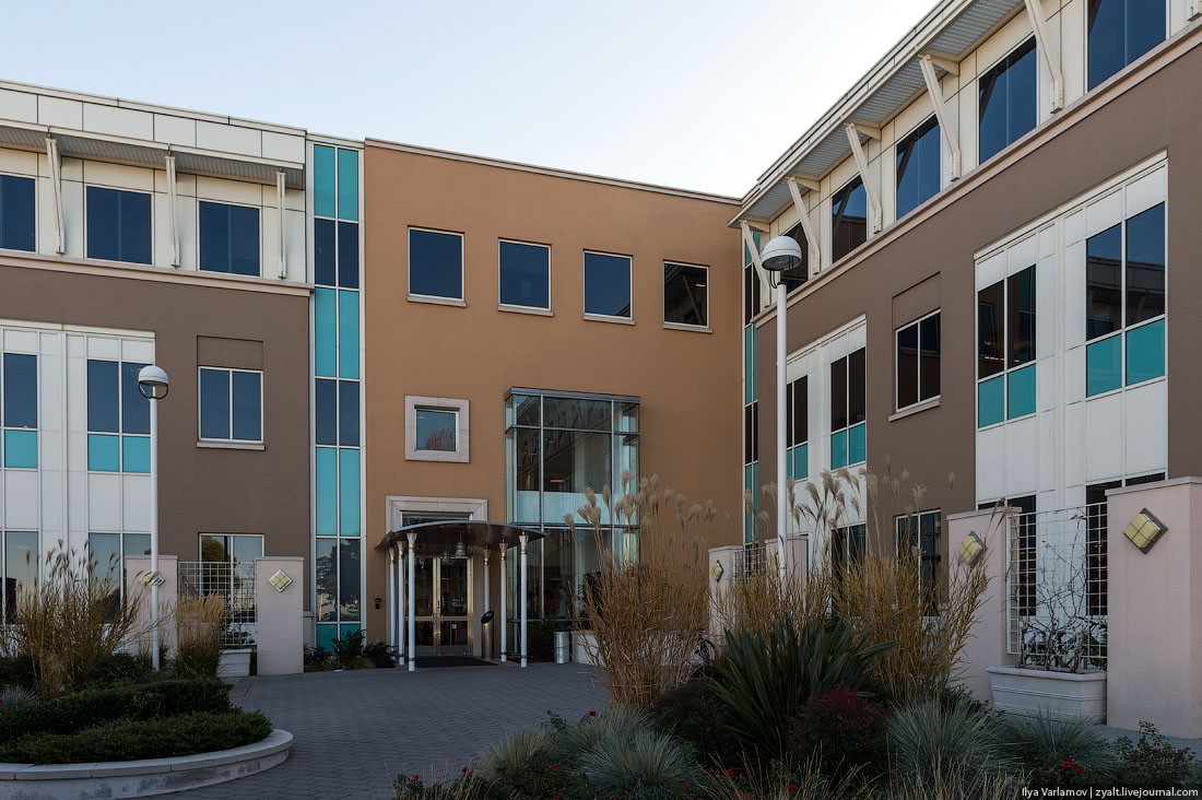 Снаружи офис ничем не примечателен. Обычные малоэтажные офисные здания, людей нет, даже вывесок никаких нет. Раньше здесь был офис SUN и другие IT-компаний. Вот так выглядит вход, через который на работу ходит Марк Цукерберг