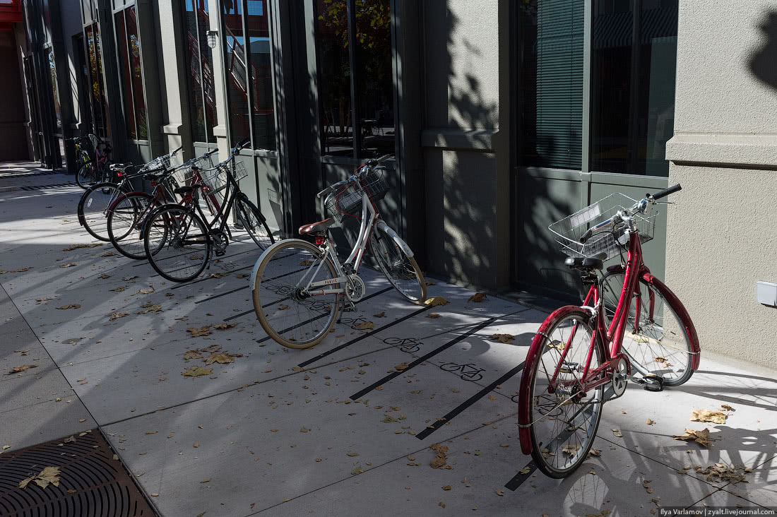 Уличная парковка. Это бесплатные велосипеды, которые может взять любой сотрудник