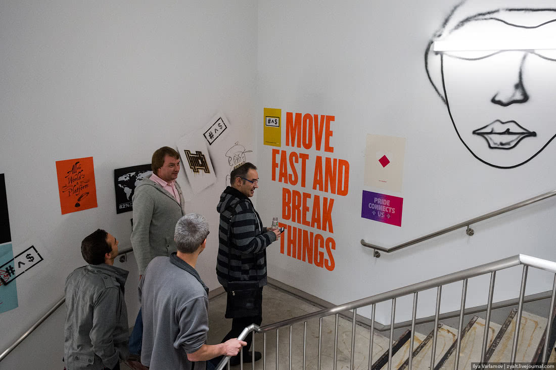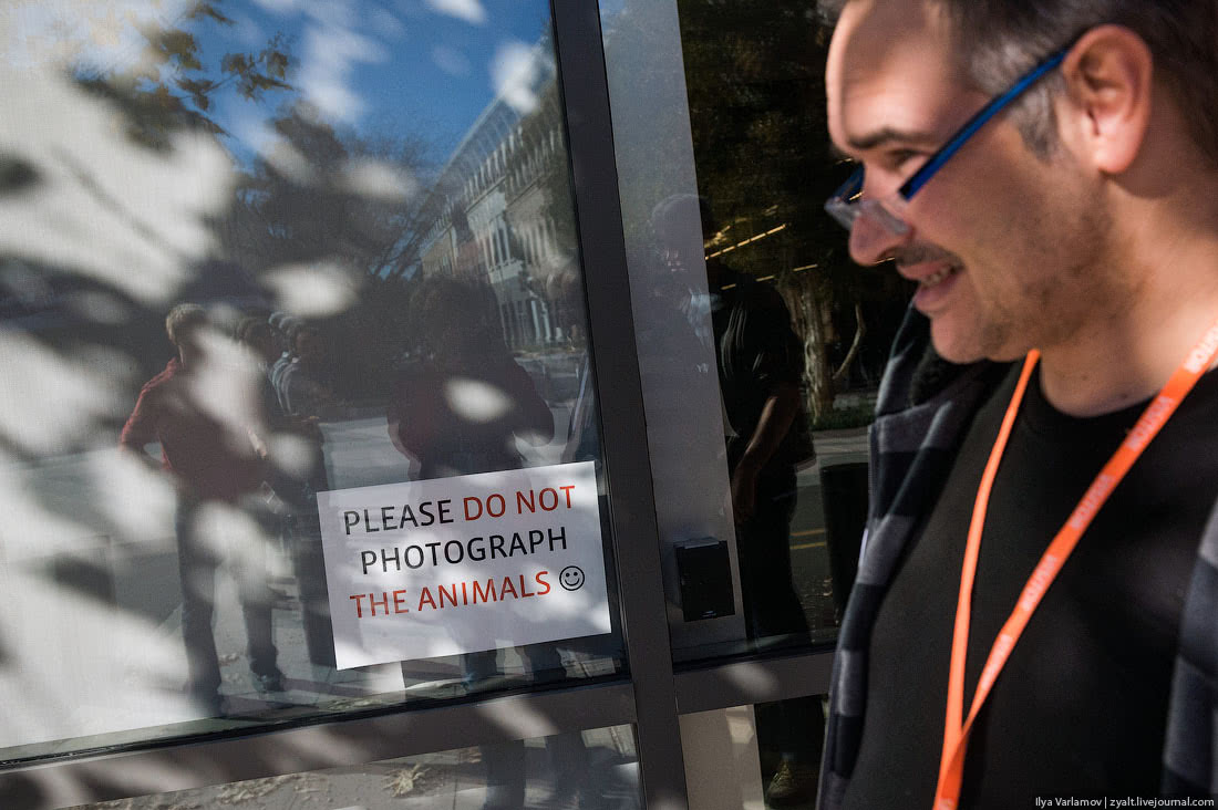 Есть еще одно правило - нельзя фотографировать Цекерберга. У него рабочее место никак не выделяется среди других - один из столов в глубине большого зала. Иду я по офису, а он в переговорной с кем-то болтает. Конечно, соблазн поднять камеру и сделать фото основателя самой популярной соцсети велик, но нельзя. На стекле переговорной даже есть табличка, которую повесил Марк:
