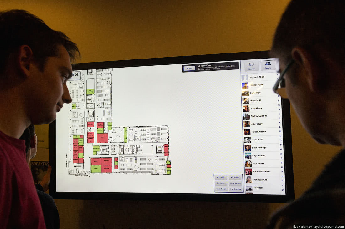 В Фейсбуке работают сотни людей. Чтобы можно было найти нужного вам человека, на стенах висят мониторы. Вводишь имя и фамилию, а тебе показывают дорогу к рабочему месте