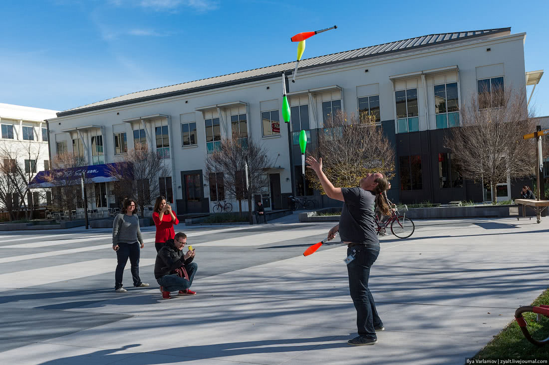 Жителей города постоянно развлекают. То выступают акробаты, то приглашенные музыканты дают концерт, а это один из сотрудников учит других жонглировать