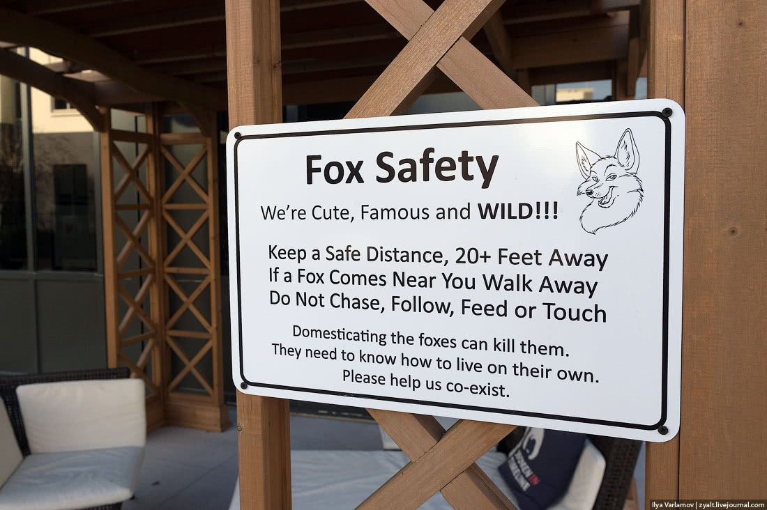 Говорят, здесь живут дикие лисы. Везде висят таблички с просьбой не кормить и не приручать их