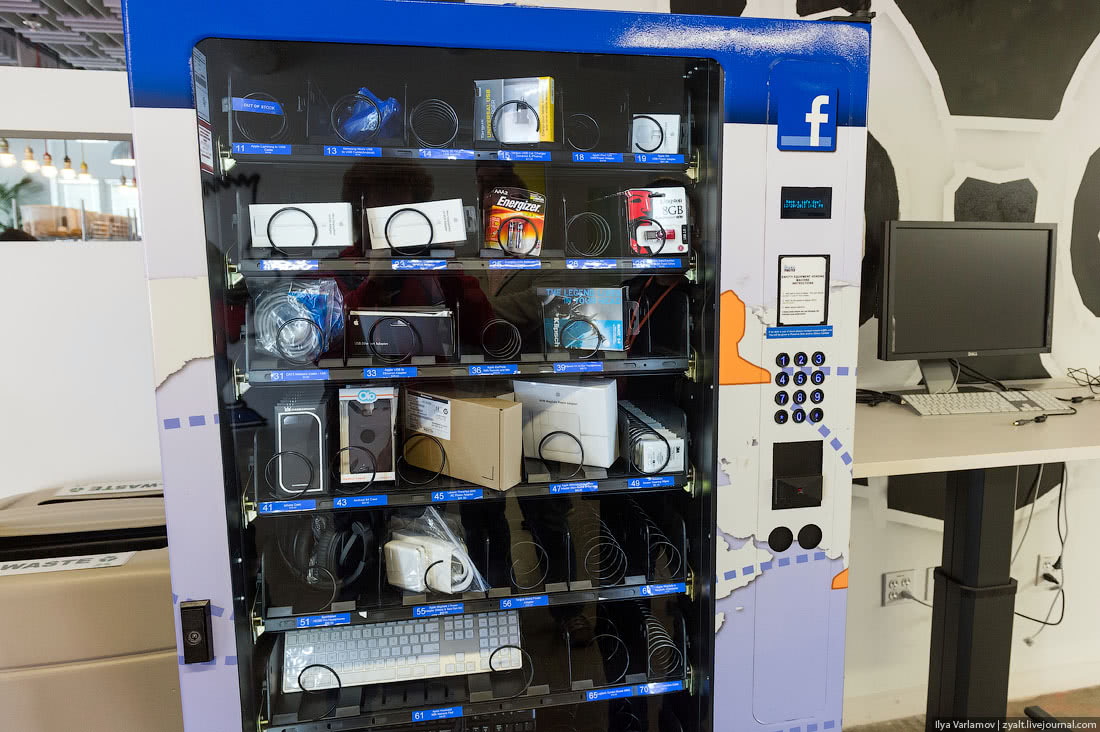 А это аппарат с различными аксессуарами. Для сотрудников все бесплатно. Забыл зарядку от ноута? Можно получить новую. Нет наушников или клавиатуры? Нужны батарейки? Фейсбук любит тебя и всегда готов помочь. Такие аппараты стоят на каждом этаже. Около каждого аксессуара в аппарате написана цена, чтобы сотрудник знал, во сколько он обходится компании. К примеру зарядка для МакБука стоит 60$. Рассчитано на совесть сотрудников, которое лишний раз постесняются взять себе новые наушники, сэкономив любимому работодателю копеечку