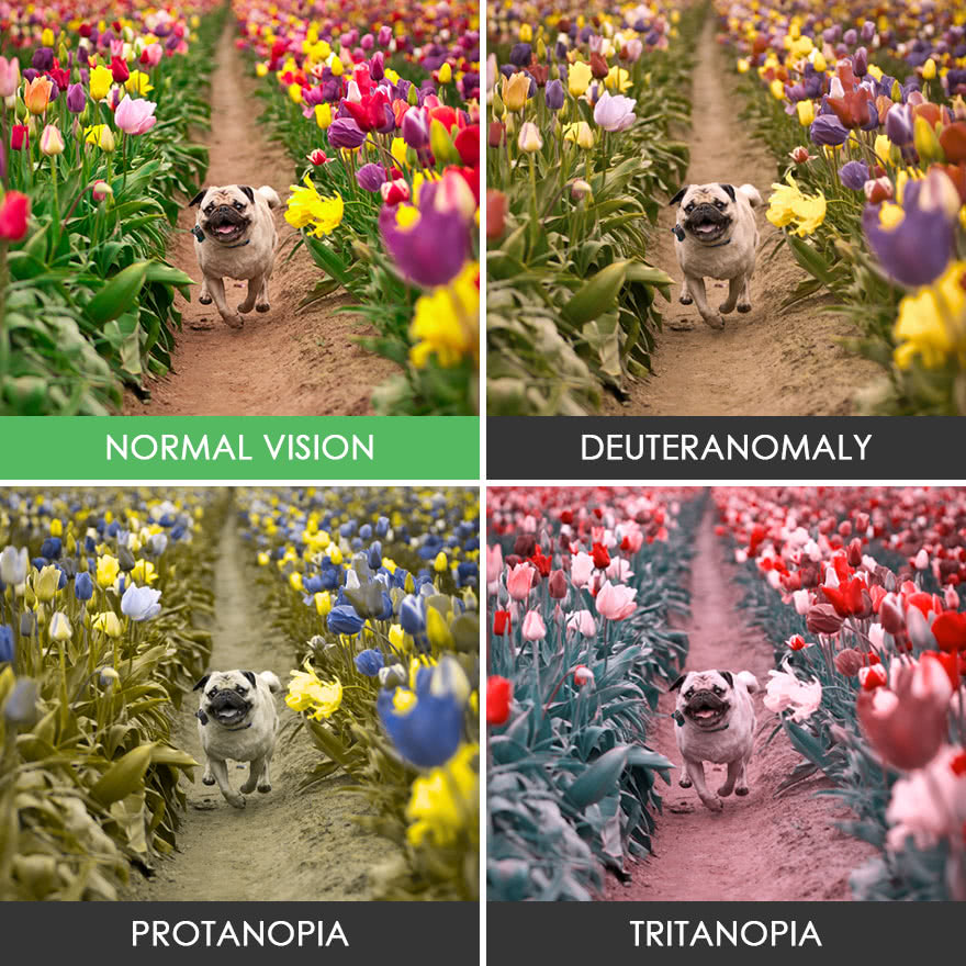 Более наглядные примеры четырех видов дальтонизма. Мопс среди тюльпанов.