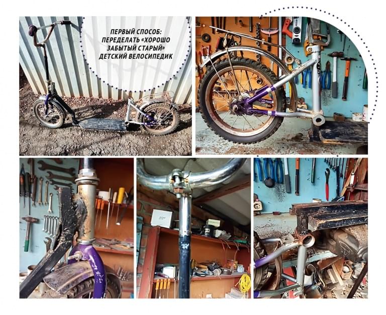 После того как мы разобрались с составными частями, можно приступить и к сборке самоката своими руками. Сделать это можно двумя способами: переделать «хорошо забытый старый» детский велосипедик или сделать самокат «с нуля». Для второго метода понадобится много инструментов, которые режут металл под определенными углами, делают в нем углубления, пазы. Этот подход – не для дилетантов! Не в каждом доме завалялись станок ЧПУ и «горячий нож», а вот болгарка и сварка наверняка есть почти у каждого. Если не найдется в гараже, одолжите у знакомых.
