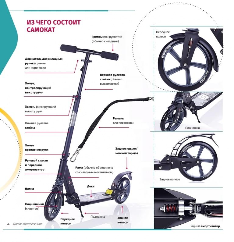Начнем с основной части – складной или цельной рамы, определяющей главные ездовые параметры. Она состоит из двух частей: рулевой колонки, на которую крепится руль, и платформы для ног – деки.