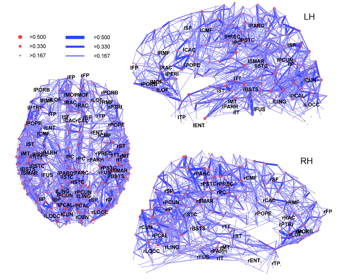 На рисунке изображен коннектом, полученный с помощью функциональной магнитно-резонансной томографии. Аббревиатуры – это названия отдельных областей интереса – участков мозга, для которых анализировались связи. Толщина линии – сила связи между парой участков.