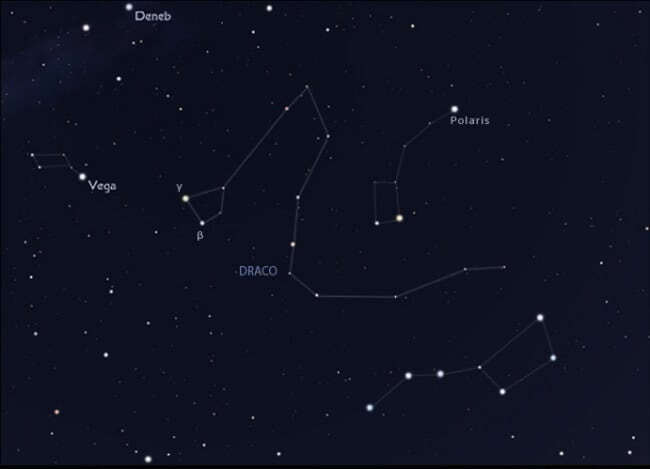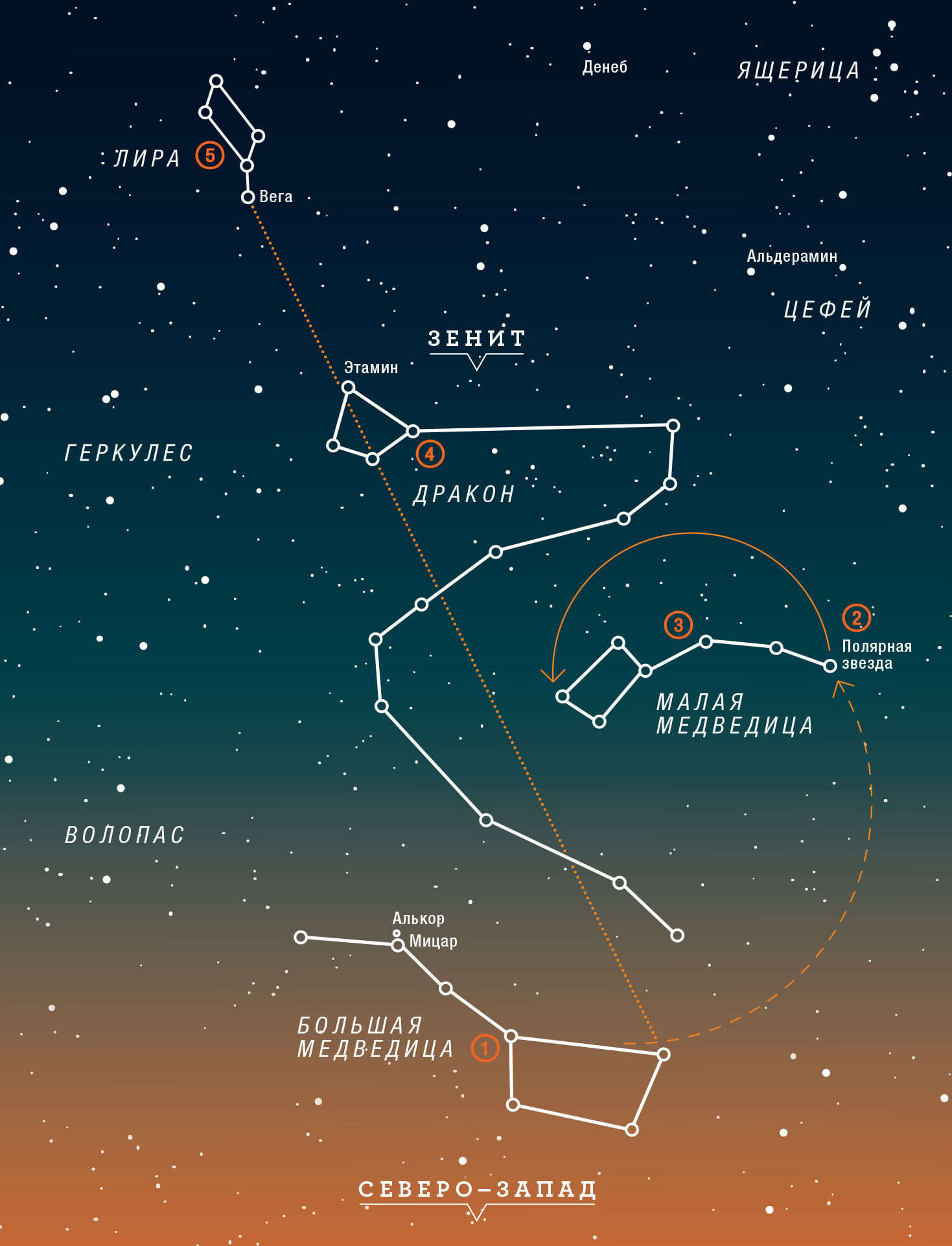 Ближайшая к голове дракона яркая звезда и второе по яркости светило северного неба — Вега. Рядом с ней в направлении от Медведиц и Дракона есть четыре блеклые звездочки, которые ложатся на параллелограмм. Это созвездие Лиры. Именно в его окрестностях ученые ищут внесолнечные планеты. Эти правила работают в июле в средних широтах. Наблюдать нужно около 1 часа ночи по московскому времени, встав лицом к Большой Медведице.