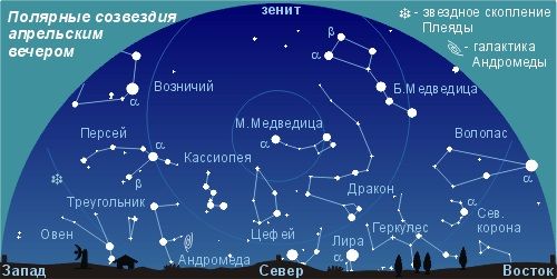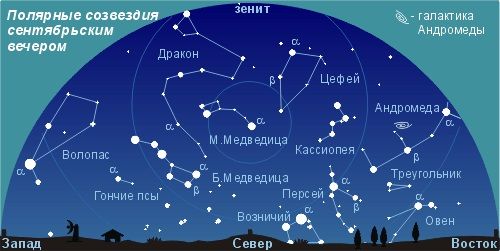 Рядом с Полярной находится компактная группа звезд в виде латинской буквы "W" (или перевернутой "М"), это - созвездие Кассиопея. Благодаря этой характерной форме оно обычно находится легко.