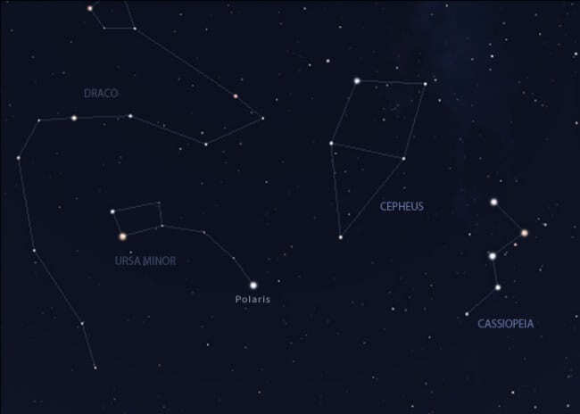 Если совершать мысленное вращение вокруг полюса от Кассиопеи против часовой стрелки, то следующее созвездие - Цефей, звезды которого расположены в виде "домика" с остроконечной крышей. Найти его труднее, поэтому помните, что вершина "домика" находится примерно между Кассиопеей и Полярной и обращена примерно в сторону последней. Созвездие Цефей (Cepheus) наблюдается на территории России, но разглядеть его нелегко.