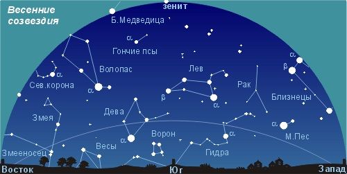 Весной мы с вами можем увидеть созвездие Льва. Встанем спиной к Полярной звезде, т.е. лицом к югу. В это время в верхней кульминации, пересекая небесный меридиан, и находится созвездие Льва. Это созвездие напоминает фигуру сидящего льва с гордо поднятой головой. Найти его легко по характерной трапеции, образованной яркими звездами a (Регул), b (Денебола) (основание фигуры), d и g. От последней (правый верхний угол трапеции) по нескольким звездам обычно проводят шею и голову животного. Над головой Льва расположено небольшое непримечательное созвездие Малый Лев.