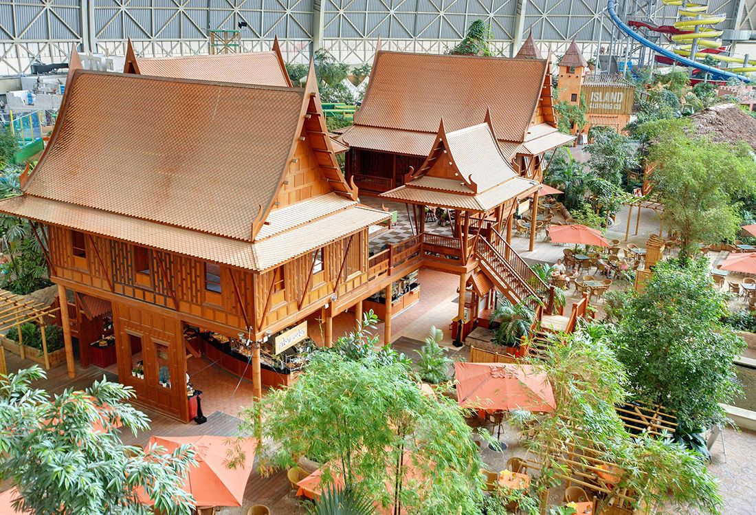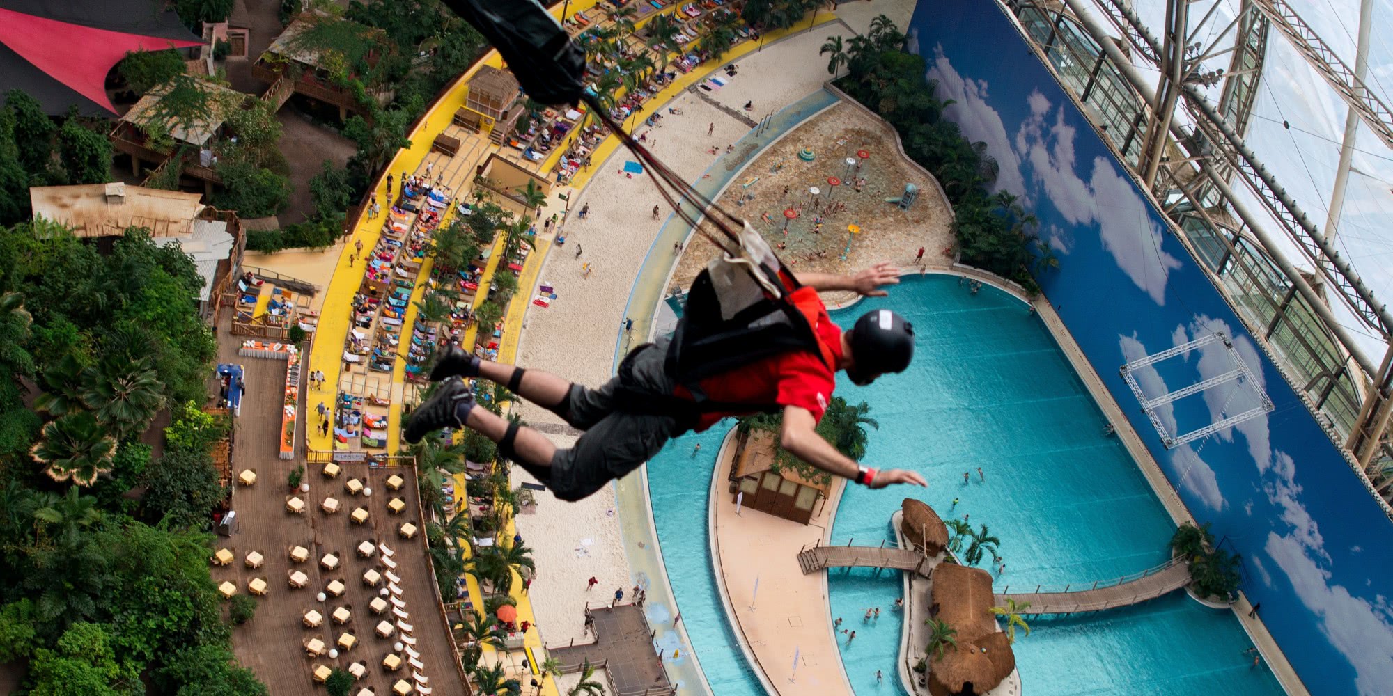 Это "Ттропический остров" - самый большой крытый аквапарк в мире. Находится он на северо-востоке Германии, а построен на месте бывшей военной базы (раньше здесь была стоянка дирижаблей). Длина павильона - 360 метров, ширина - 210. Круглый год температура воздуха - плюс 25ºС, воды - плюс 28ºС.