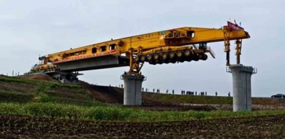 Необычная китайская строительная машина SLJ900/32 длинной 91,5 метров и весом 580 тонн нависая над пропастью, укладывает секции моста.