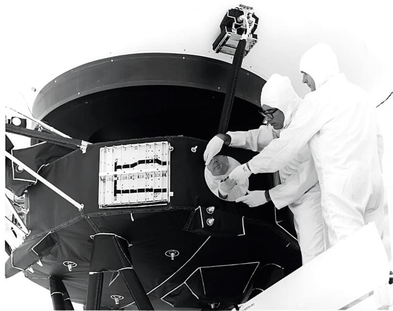 Инженеры крепят пластинку с сообщением к «Вояджеру‑1», 1977г. Фото: НАСА/JPL, www.jpl.nasa.gov