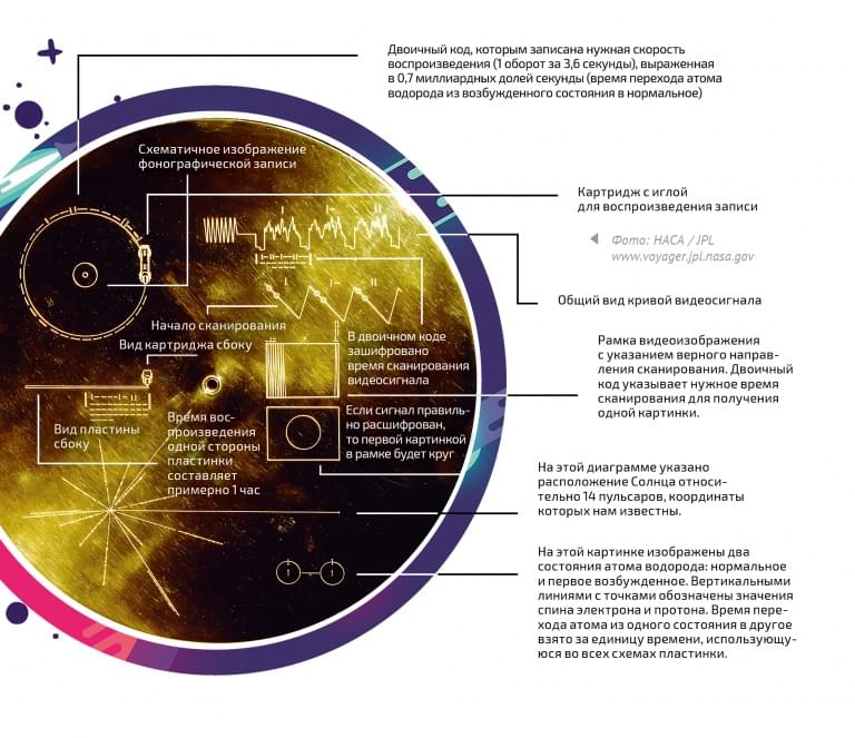 ЗОНДЫ СТРАТОВАЛИ 5 сентября и 20 августа 1977 года. На обоих кораблях установили дискообразные коробки из алюминия с новыми сообщениями. На самих коробках были выгравированы все те же схемы состояний атома водорода и карты пульсаров с обозначением центра галактики и расположения Солнца. Также снаружи нанесли инструкцию по установке иглы для чтения 30-сантиметровой золотой пластинки (на самом деле алюминиевой, но, поскольку под воздействием космической пыли алюминий может подвергнуться эрозии, верхнее покрытие сделали из золота). Ее спрятали внутри – вместе с фонографической капсулой и иглой для воспроизведения записи. «Вояджер-1» вышел за пределы Солнечной системы в сентябре 2013 года, а его брат добрался туда лишь в декабре 2018-го.