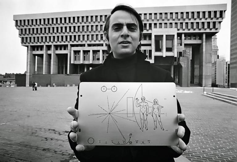 Выдающийся популяризатор науки Карл Саган задумал идею вещественных посланий в космос в 1971 году, будучи профессором астрономии и космических исследований Корнельского университета и директором лаборатории по изучению планет. Он считал, что каждый корабль, отправляемый в дальнее путешествие, должен быть снабжен алюминиевой пластинкой с краткой записью о человечестве. Руководство университета поручило ему составить содержание послания, и 2 марта 1972 года первая такая пластинка отправилась к Юпитеру и дальше, за пределы Солнечной системы на борту космического корабля «Пионер-10». Ее копия пролетела мимо Сатурна 5 апреля 1973 года с кораблем «Пионер-11». Сейчас оба корабля отдаляются от Солнца, но связь с ними утеряна, и о дальнейшей судьбе пластинок ничего неизвестно.