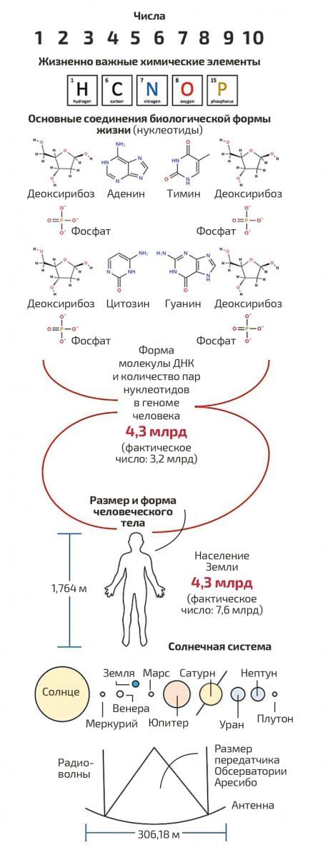 НАЧИНАЕТСЯ ЗАКОДИРОВАННОЕ сообщение с числовой последовательности от одного до десяти, записанной в двоичной форме. Это своеобразный шифр, с помощью которого получатели смогли бы прочесть дальнейшие записи. После идут атомные числа водорода, углерода, азота, кислорода и фосфора – элементов, составляющих основу земной жизни. Второй блок – руководство для расшифровки третьего, который описывает формулы нуклеотидов ДНК: дезоксирибозы, фосфата и пары азотистых оснований аденин-тимин и гуанин-цитозин. Следующий блок показывает форму спирали ДНК и число нуклеотидов в ДНК человека. Затем физики решили расположить данные о среднем росте человека. Все числовые значения переведены в единицы длины волны посылаемого сообщения. Заканчивается послание зарисовкой Солнечной системы и телескопа в Аресибо.