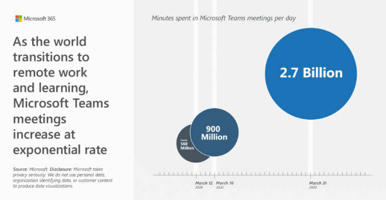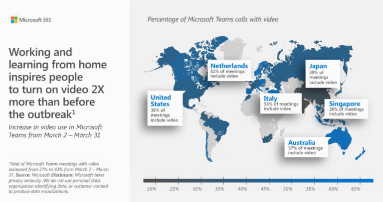 По утверждениям компании, в Китае ежедневное количество пользователей платформы Teams всё ещё сохраняется на уровне вдвое выше показателей конца января 2020 года. Более того, оно продолжает расти даже после частичного снятия карантина, так как многие работники предпочитают продолжить работу у себя дома.