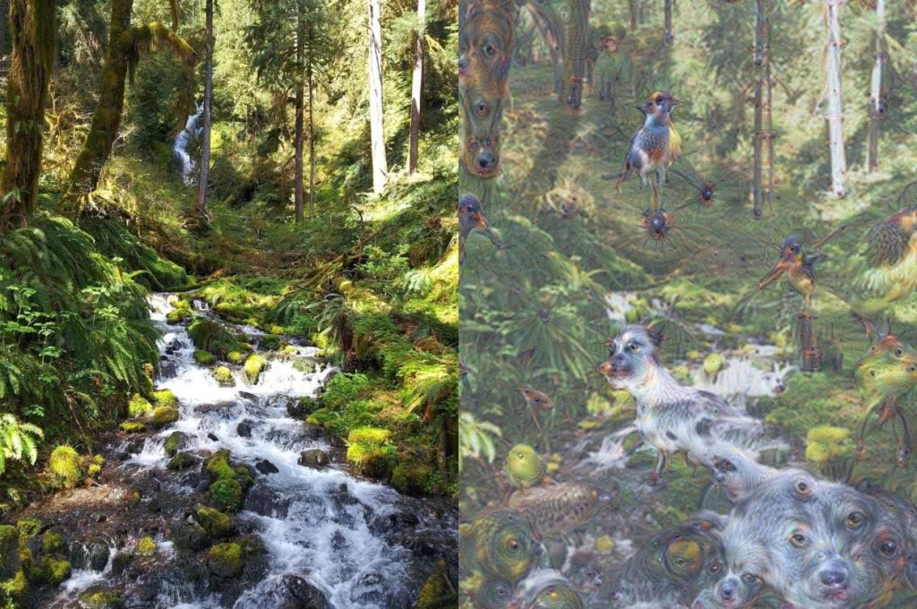 Дело в том, что из-за петли обратной связи нейронная сеть будет пытаться распознавать несуществующие на картинке объекты и улучшать их изображение.