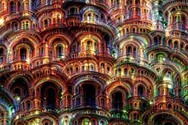 Google в своём блоге объяснил, что нейронную сеть «кормят» в основном изображениями животных, потому именно их она и распознает, хотя иногда в очень сюрреалистических вариациях. На этой фотографии результат обработки фотографии сетью, которая учится распознавать здания.