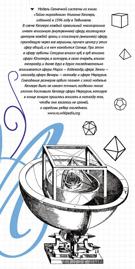 Свою первую модель Солнечной системы Иоганн Кеплер придумал, обратившись к классической геометрии. Он вписал в нее объемные фигуры в виде правильных многогранников, но изящество теории было разрушено первыми же эмпирическими данными. Автор отнесся к поражению иронично, сделал металлический макет своей не подтвердившейся теории в виде подставки для напитков и подарил ее герцогу Вюртембергскому.