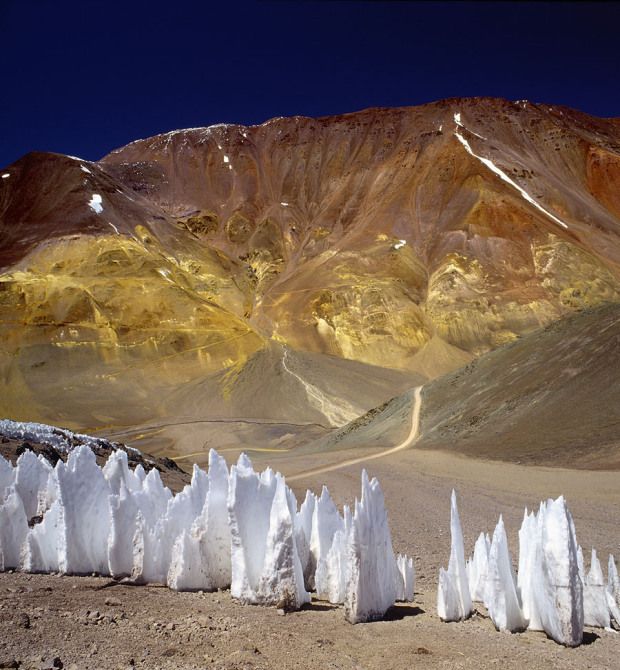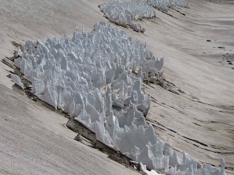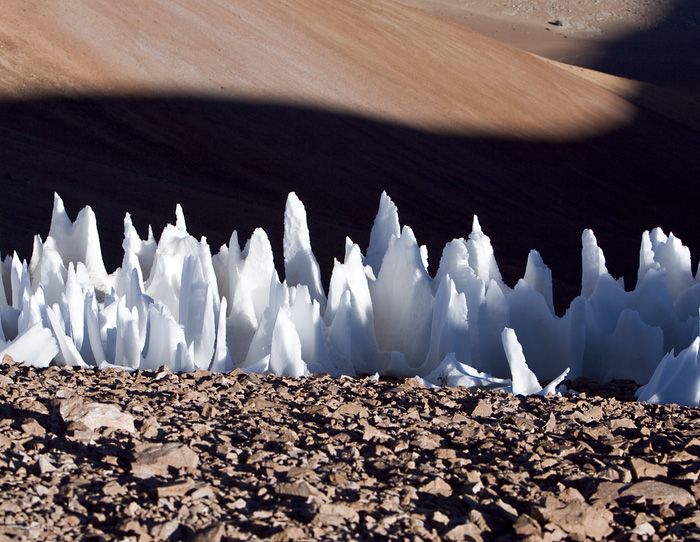 Одно из них гласит, что своей формой «пенитентес» (испанское название «кающихся грешников») обязаны более экзотическому процессу. Ночами влага из атмосферы осаждается, как иней, на ледяных пиках. Но кристаллики льда электризуются и выстраиваются вдоль линий магнитного поля Земли.