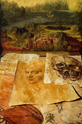 Для меня Леонардо да Винчи - это сплав технологии и искусства. Поэтому сразу было решено отталкиваться от его работ. Хотелось передать незримое присутствие гения. Так, были выбраны чертежи и наброски, как бы намекающие на скорое возвращение к работе. Процесс состаривания и придачи текстуры бумаге производился при помощи 4 пакетиков чая) Завершали работу подбор соответствующего освещения, сама непосредственная съемка композиции и дальнейшее объединение с задним планом.