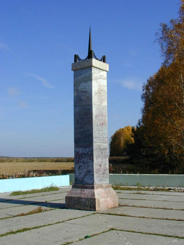 Этот обелиск был установлен в 2004 году, он находится к Екатеринбургу ближе всех — на 17 км Ново-Московского тракта. Именно сюда по традиции приезжают свадебные процессии. Каждая пара привязывает возле памятника ленточку на память.