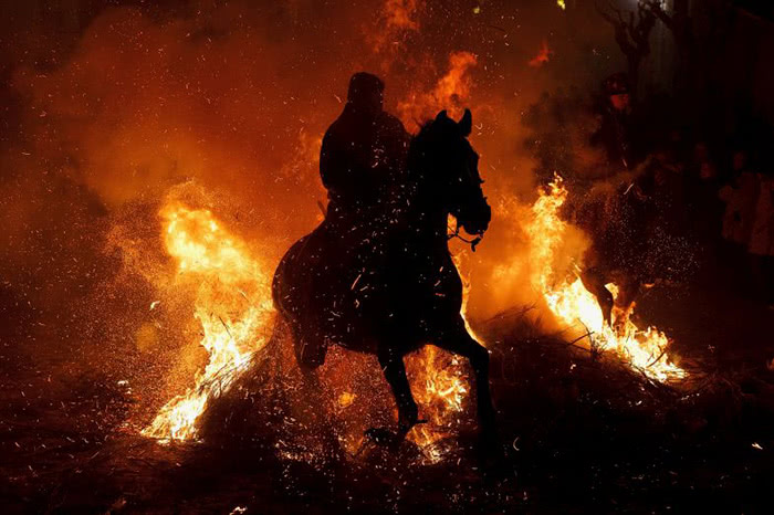 Огненный фестиваль проводят ежегодно в поселке Сан-Бартоломе-де-Пинарес, Испания. Вечером в июне, накануне Дня Святого Антония, наездники заставляют своих лошадей скакать сквозь огненные преграды. Святой Антоний является покровителем животных, а огонь очищает от демонов.