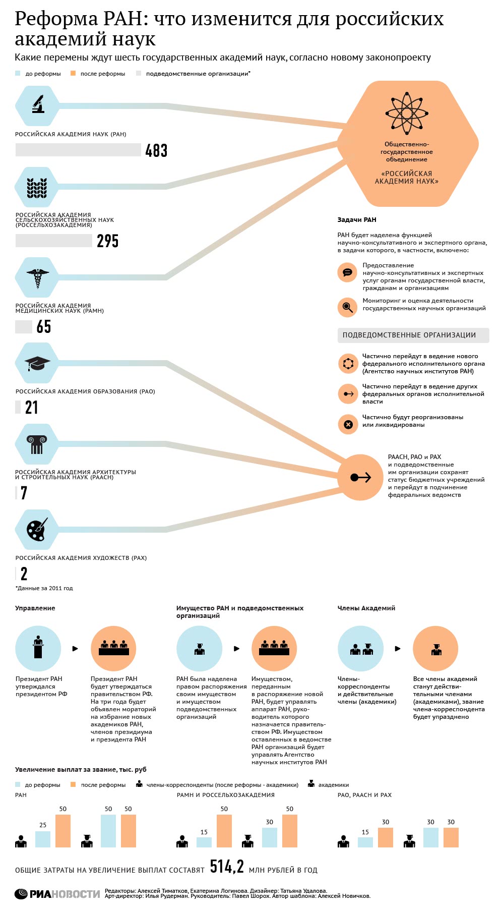 Реформа предполагает соединение Российской академии наук, Российской академии медицинских наук и Российской сельскохозяйственной академии. В итоге получится общественно-государственная Российская академия наук. Их научные учреждения перейдут в подчинение органа, который планируется подчинить правительству (норму о формировании аппарата РАН, который должен был заниматься организационным, правовым, аналитическим, информационным, финансовым и материально-техническим обеспечением деятельности РАН, отклонили). Это означает, что РАН утрачивает свою главную привилегию — право по собственному усмотрению распоряжаться выделенными ей из бюджета деньгами и фактически превращается в "клуб ученых".