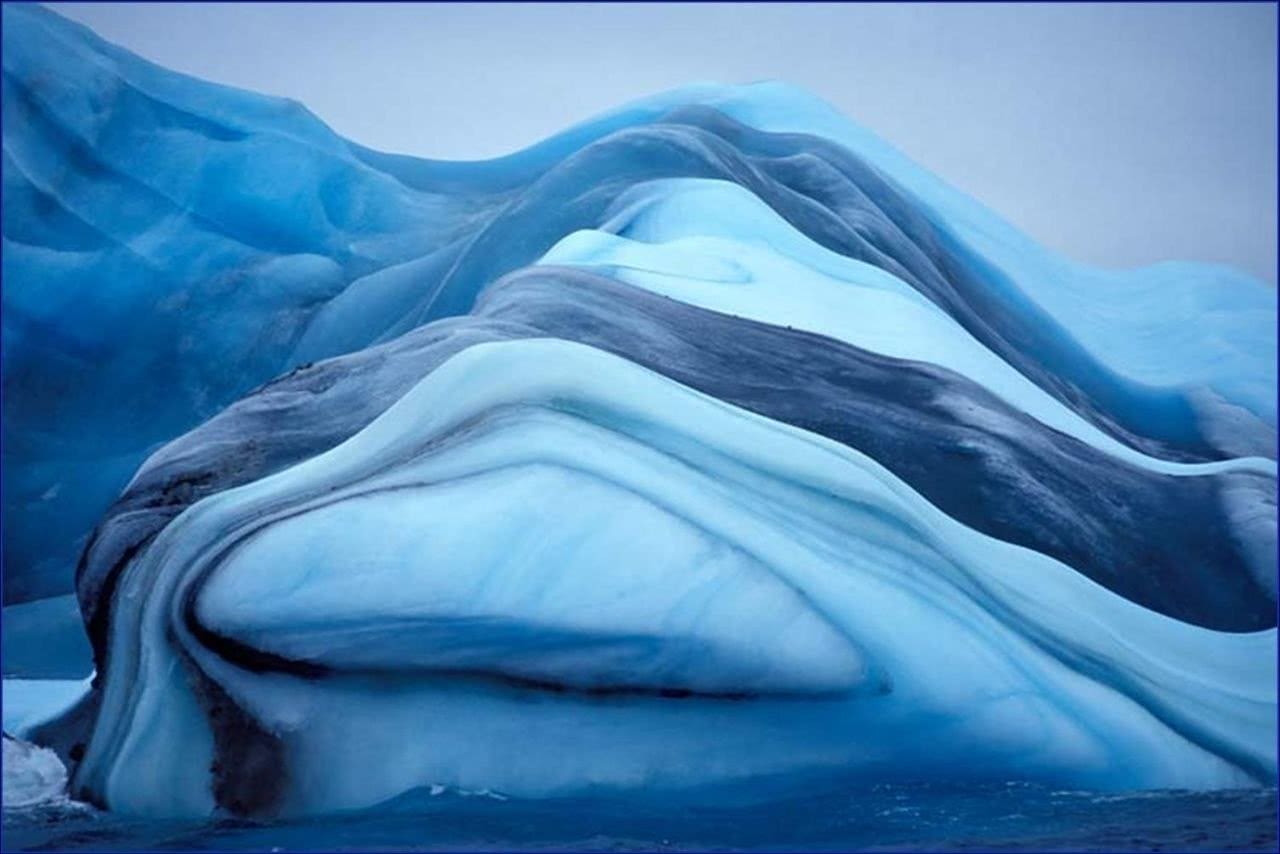 Темные разводы - это пыль и вулканический пепел, которые оседают на айсберге во время его образования. Такие ледники рождаются как ледяные шапки на вершинах вулканов, а при их нагревании "сползают" в воду.