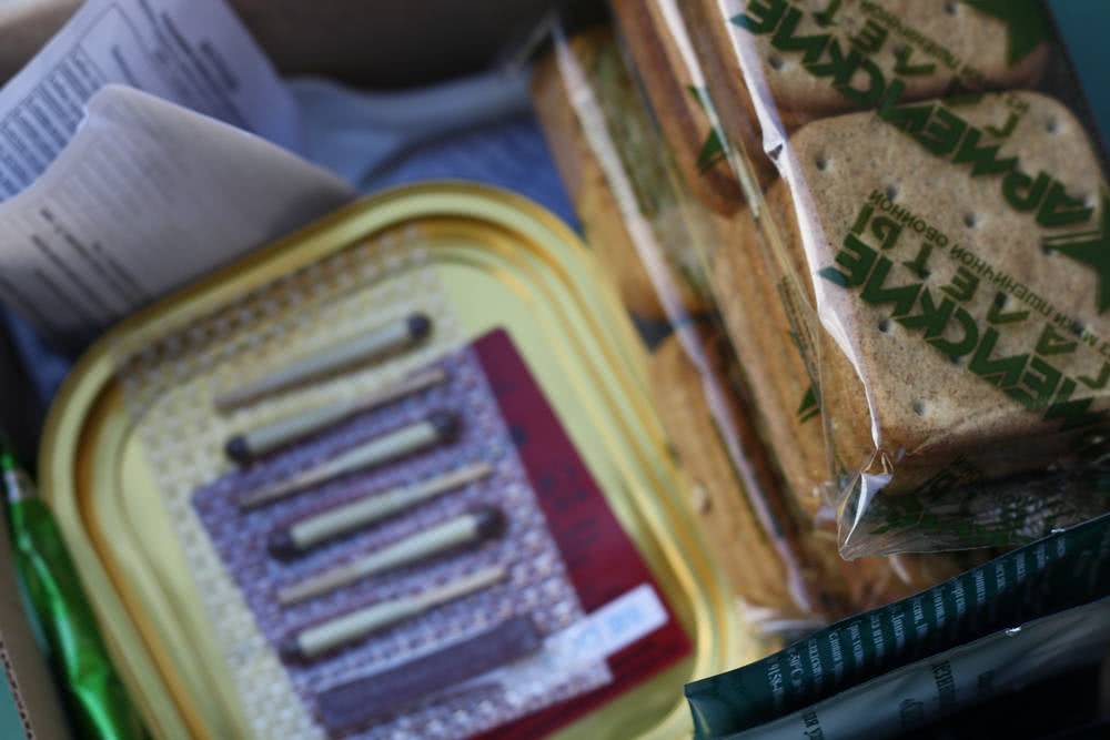 Хлебцы (галеты) армейские из муки пшеничнойКаша гречневая славянскаяГовядина тушенаяМясо с зеленым горошком и морковьюИкра овощнаяСыр плавленный стерилизованный (!)Повидло яблочноеКонцентрат для напитка тонизирующийЧай черныйСахар, соль
