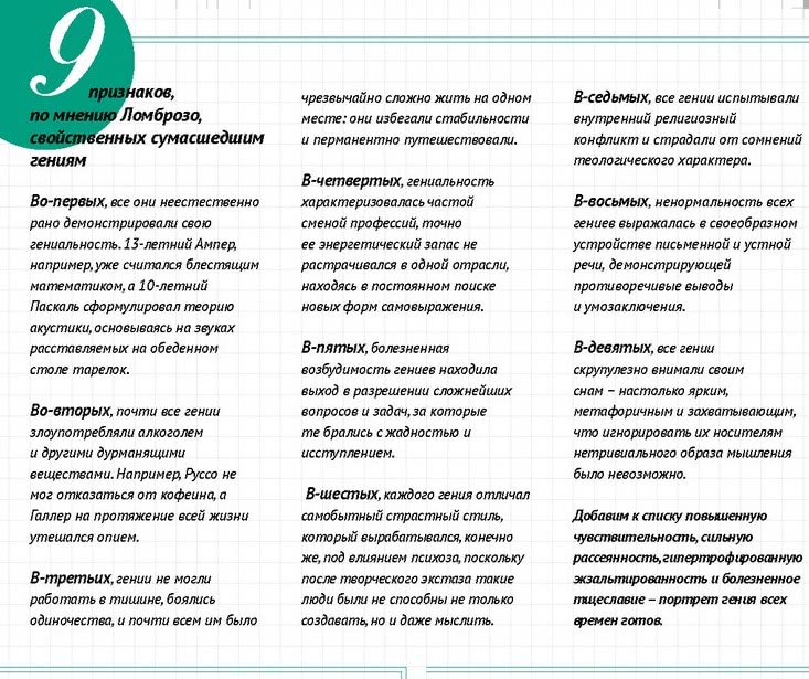 Теория Ломброзо быстро обретала популярность и последователей, и слава сослужила автору плохую службу: критики прошлись по его изысканиям, отметив, что психиатр преувеличивает роль биологической составляющей. Основным упущением считали то, что теоретическая база не учитывала социальные факторы преступности. Но мнение скептически настроенных коллег не повлияло на разработки криминалиста, и его деятельность приняла еще более масштабный характер. В 1895 году вышла и получила большой резонанс новая работа Ломброзо «Гениальность и помешательство», в которой ученый поставил в один ряд аномальную деятельность мозга, характерную для эпилептоидного психоза, с тем, что люди определяют как гениальность. Этот труд часто называют «ярким примером превышения врачебных полномочий», и, в общем-то, не зря. В нем Ломброзо доказывает, что душевнобольные и гении одинаково реагируют на атмосферные явления, а расовая принадлежность и аномалии черепа определяют их судьбоносный путь. Анализируя жизни Ампера, Свифта, Канта, Ньютона, Шопенгауэра, Руссо и других носителей гениальной мысли, Ломброзо раздает заочные диагнозы, безапелляционно приравнивая знаменитостей к помешанным и не всегда ссылаясь на медицинские свидетельства. Он выделил девять особенностей, по которым можно определить гения и умалишенного в одном лице. Упущением этой теории было то, что в реальной жизни мы можем найти огромное количество гениальных людей, не имеющих ни одного из девяти признаков. Тем не менее, Ломброзо считал «Гениальность и помешательство» ключом к пониманию «таинственной сущности гения», а также религиозного фанатизма, вызывающего общественные катаклизмы.