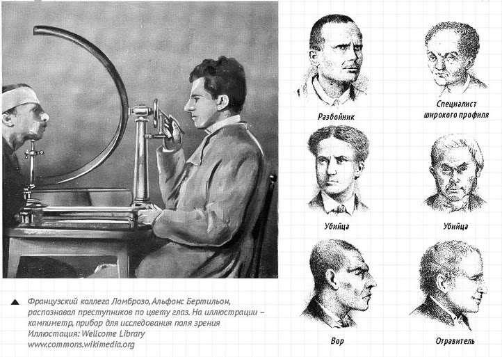 Ломброзо разработал специальный прибор – каниограф, с помощью которого замерял части лица и черепа у пойманных преступников, а потом проводил тщательную аналитику полученных данных. В результате колоссальной работы Ломброзо удалось типизировать бандитов и поделить их на категории, самые распространенные из которых – убийцы, воры и насильники. У каждого типа «дегенератов» (по мнению Ломброзо, особая разновидность рода человеческого, не имеющая никакого отношения к душевнобольным) были свои физиологически особенности. Личности со склонностью к убийству угадывались в низколобых людях с приплюснутым или орлиным носом и массивными челюстями, выпирающими надбровными дугами, развитыми скулами и стеклянным взглядом. Воров отличали небольшие блуждающие глаза, подвижность мимики и рук; их брови были сдвинуты, борода редка, уши оттопырены, носы вздернуты. Взгляд насильников, наоборот, был живым и заинтересованным, телодвижения – мягкими, губы чувственными, голос сиплым. Прирожденные противники общественной морали и нравственности в целом, по наблюдениям ученого, отличались укрупненным (по отношению к черепу) лицом, в чем Ломброзо усматривал явный признак нижайшего биологического строения. Таких людей – homo delinquent – он считал недоразвитыми, предлагал обнаруживать их еще в младенчестве и изолировать от общества, а лучше – сразу уничтожать, чтобы оздоровить общество.