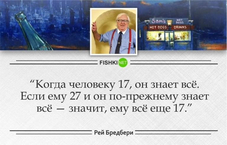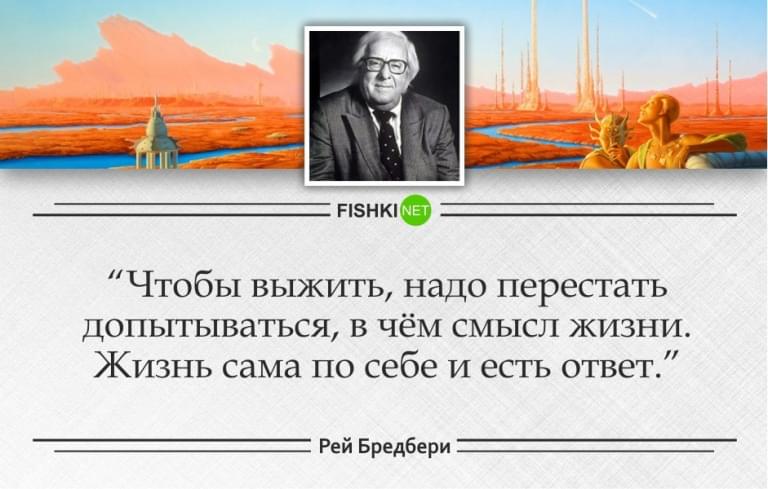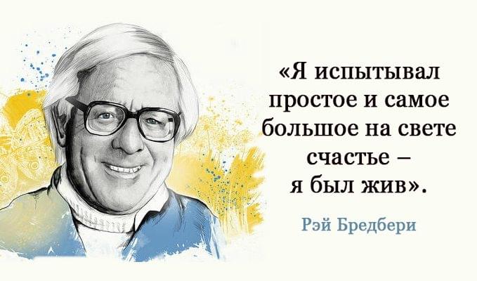Удивительный писатель и человек! Прожил такую долгую, сложную и плодотворную жизнь. В 79 лет Брэдбери перенес инсульт, после чего был прикован к инвалидному креслу. Но и в этом состоянии сохранял работоспособность, присутствие духа и чувство юмора.В одном из последних интервью мэтр сказал: "Знаете, а девяносто лет — это вовсе не так круто, как я думал раньше. И дело не в том, что я езжу по дому в кресле-каталке, застревая на поворотах… Сотня просто звучит солиднее. Представьте себе заголовки во всех газетах мира — "Брэдбери исполнилось сто лет!". Мне сразу выдадут какую-нибудь премию: просто за то, что я еще не умер".