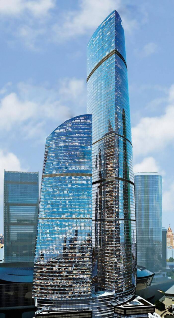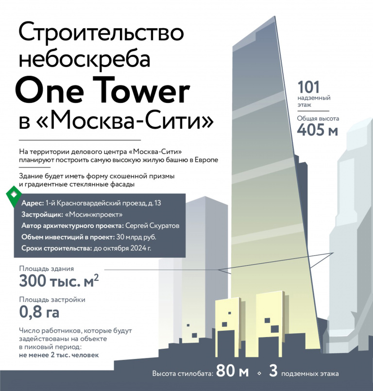One TowerСтроящаяся башня One Tower должна будет стать самым высоким небоскребом «Москвы-Сити». Ее планируемая высота – 443 м. В отличие от остальных башен, ориентированных под деловую инфраструктуру, One Tower архитекторы позиционируют именно жилым небоскребом: будут продаваться не апартаменты, как в остальном «Сити», а квартиры; строится первый в «Сити» детский сад. Для фасада выбрали форму скошенной призмы, чтобы со стороны башня напоминала парус или крыло гигантского самолета, медленно уходящее в небо, под самые облака.