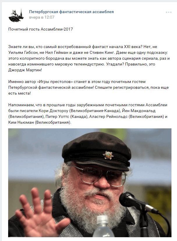 Об этом сообщают организаторы Петербургской фантастической ассамблеи на своей странице в Facebook и Вконтакте.