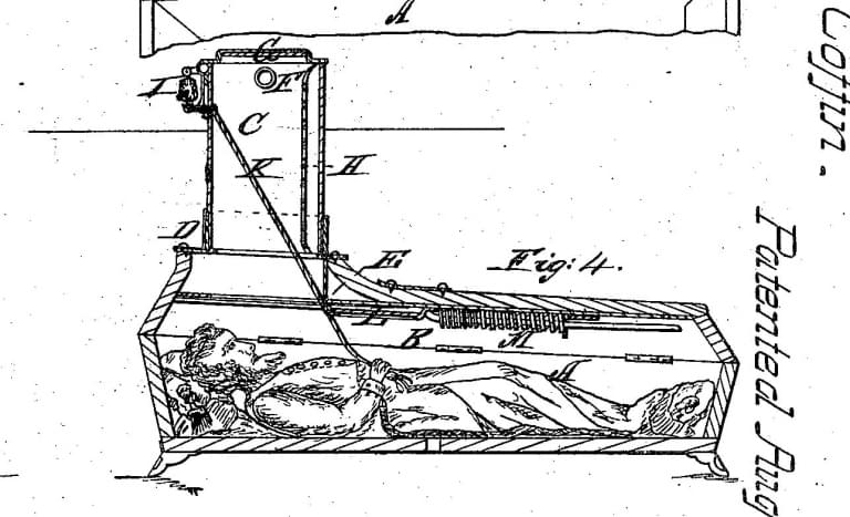 Тафофобия нашла отклик и в похоронных традициях. Еще в конце XVIII века герцог Мекленбургский в Германии запретил в своих владениях хоронить людей сразу после смерти! С этой даты должно было пройти 3 дня. Очень скоро такая традиция распространилась по всей Европе. Естественно, никому не хотелось быть погребенным заживо. А в XIX веке мастера по изготовлению гробов разработали особые «безопасные гробы». Если вдруг человека хоронили в состоянии летаргического сна, он в такой конструкции мог не только еще жить какое-то время, но даже подать сигнал о помощи. Как это было возможно? Дело в том, что из гроба наружу выводили трубку, а священник после похорон регулярно навещал могилы. А если через некоторое время из трубки не появлялся типичный запах разложения тела, могилу были обязаны вскрыть и проверить, а не жив ли там человек! Порой к трубке прикрепляли колокольчик, чтобы погребенный заживо мог подать сигнал.