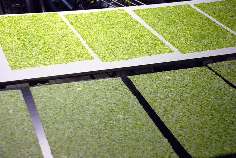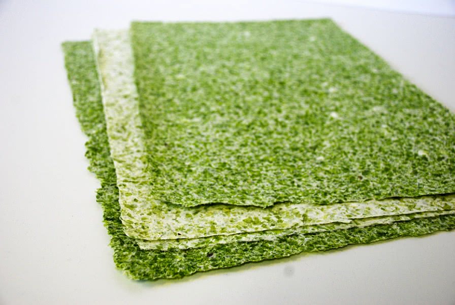Компания Goofy press предложила проект по изготовлению бумаги из водорослей. Ребята подумали, что можно сделать из них что-то полезное, а не просто отвезти на свалку. Результатом их трудов стали вот такие зеленые листы. 80% водорослей и 20% офсетной бумаги. Пахнет она не очень приятно, но зато получается довольно плоской, чтобы можно было рисовать и распечатывать на ней.