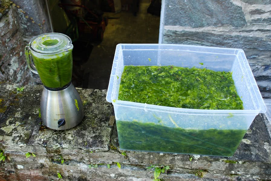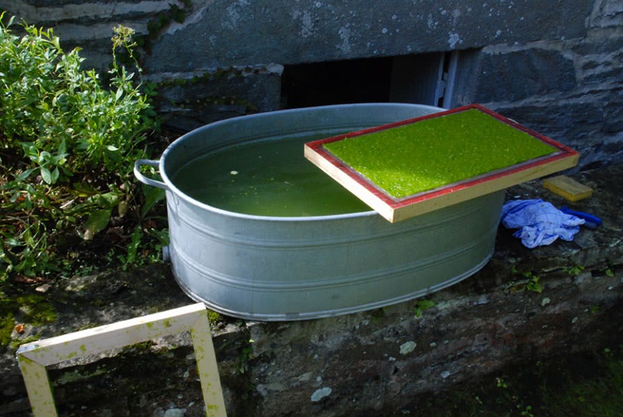 Для этого нужно собрать тину, отжать ее и повесить сушиться. Как только она высохнет, нарезать ее ножницами на мелкие кусочки, сложить в ступку и, смачивая водой, толочь минут пятнадцать. Затем надо нагреть смесь тины с водой в кастрюле, после - остудить и процедить воду через мелкое сито. Слегка надавливая, отожмите массу и переложите на лист бумаги.